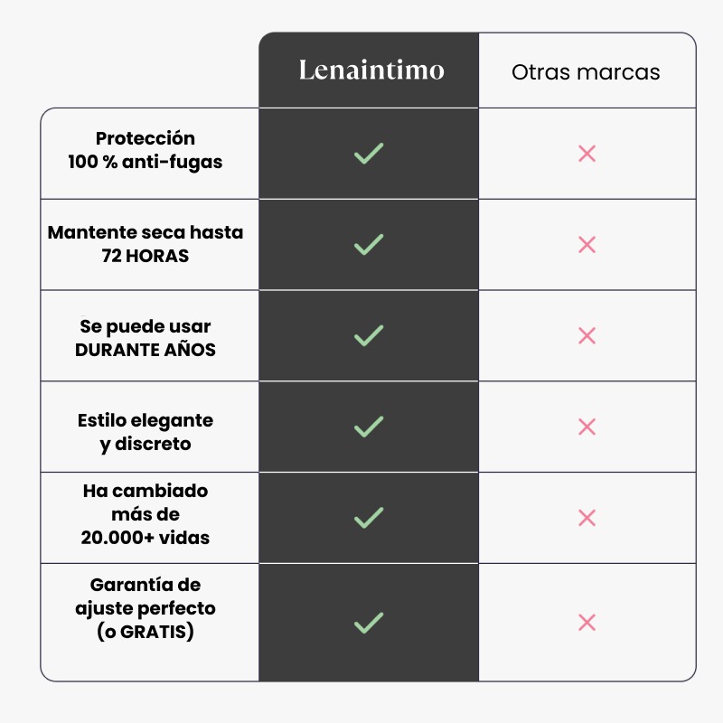 Diseñamos Lenaintimo para superar a la ropa interior a prueba de fugas convencional en comodidad, protección y confianza. Así es como nos comparamos.